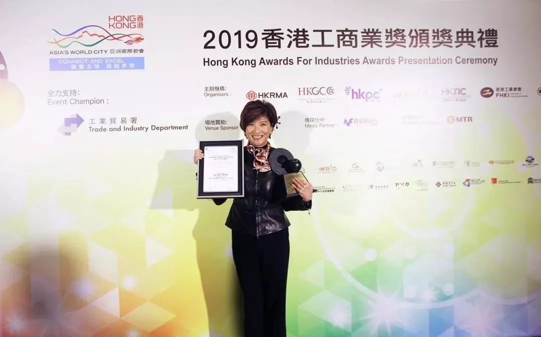 蔣麗婉女士上臺(tái)接受主辦嘉賓頒授2019香港工商業(yè)大獎(jiǎng)