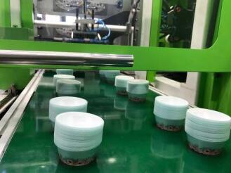 ????????伊之密PacPro薄壁包裝產品成型方案在現場也進行了展示,2.2秒內高速成型一出四貼標圓形容器。