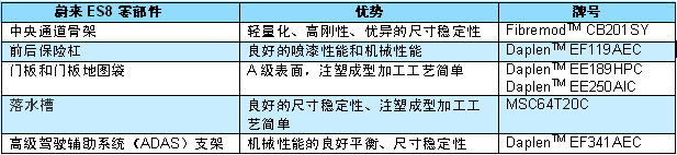 ????????在采用北歐化工和博祿產品生產的各項蔚來ES8內外飾零部件中,設計新穎、功能強大的中央通道骨架是另一大亮點——該零部件適合司機或乘客存儲名貴手提包。北歐化工和博祿的Fibremod? CB201SY為碳纖維填充聚丙烯改性材料,是Fibremod?系列中的一款超輕量化產品。采用這款材料生產的中央通道骨架有利于為客戶提供更高的價值:零部件減重20%(與采用傳統產品40%長玻纖增強聚丙烯相比)、具有更好的尺寸穩定性、高剛性,且適用于注塑成型工藝。