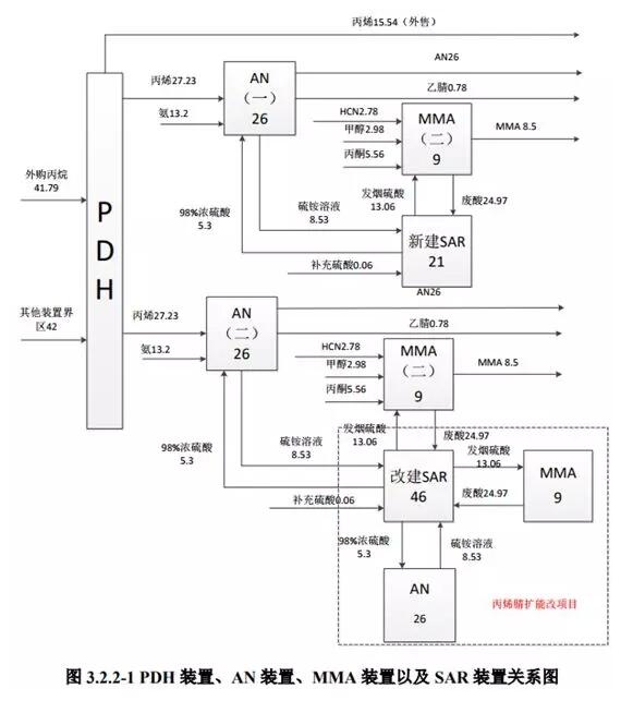 丙烷脫氫(PDH)、丙烯腈(AN)裝置、甲基丙烯酸甲酯(MMA)裝置以及廢酸回收(SAR)裝置之間關系圖: