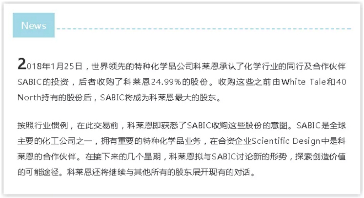 ????????一些分析師表示,在科萊恩上周宣布其首席執(zhí)行官退出、今年上半年虧損并擱置了與SABIC的合資計劃后,擁有科萊恩25%股權(quán)的SABIC可能會考慮接管該公司。