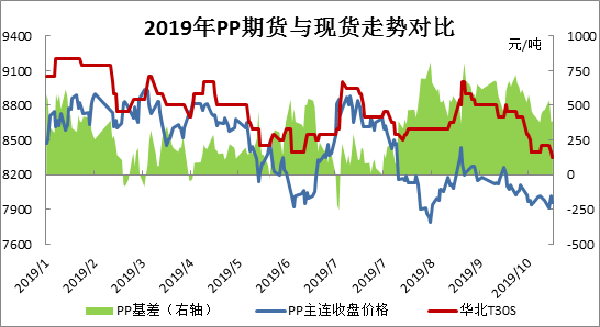 ????????期貨是未來的現貨,現貨是期貨的折現,兩者本是同一產品只是不同交割期。現貨是期貨的定價之錨,現貨價格的走向更是要瞄準期貨價格的移動方向。如圖所示,PP期貨和現貨大部分時間走勢一致。通多對兩者長期指數數據分析,相關系數能達到0.95以上。特別是近幾年,傳統貿易日漸沒落,代之而起的是點價貿易,基差貿易和含權貿易等新型貿易方式。基差作為現貨和期貨之差,是預期的供應和需求變化之差值的體現,產業客戶和大機構客戶商談固定的基差為升貼水,通過現貨=期貨+升貼水來制定價格。