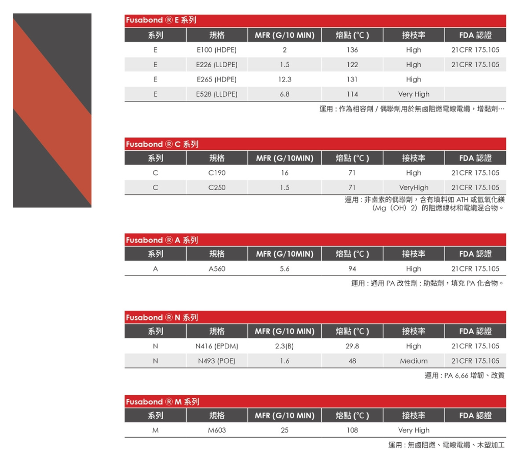FUSABOND? 為陶氏 (Dow) 的功能性接枝聚合物系列,通常在聚烯烴或工程塑膠中引入 相容劑 / 接枝劑 的角色。其主鏈為 PE 或 PP,並在分子上接枝功能性基團(如馬來酸酐 MAH),藉此改善與極性材料的相容性與黏著性。主要用於提升木塑複合材料 (WPC) 與 電線電纜 (W&C) 的性能。其基材為 乙烯-丙烯酸共聚物,再透過 無水馬來酸酐 (MAH) 接枝 技術製成。