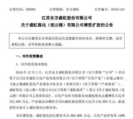 盛虹1600萬噸/年煉化項目增資50億,獲產業基金入股加持 12月5日,江蘇東方盛虹股份有限公司發布關于盛虹煉化(連云港)有限公司增資擴股的公告。公告稱,東方盛虹的全資子公司江蘇盛虹石化產業發展有限公司在連云港市,與連云港盛虹煉化產業基金合伙企業(有限合伙)、盛虹煉化(連云港)有限公司簽訂《關于盛虹煉化(連云港)有限公司之投資協議》,石化產業作為原股東向盛虹煉化認繳增資人民幣252,000萬元,產業基金以增資方式向盛虹煉化投資人民幣248,000萬元,前述投資全部計入盛虹煉化注冊資本。