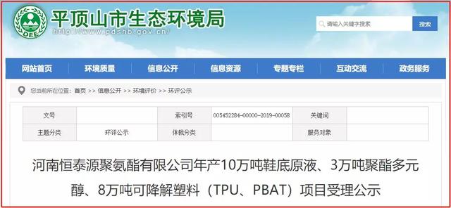 2019年12月13日,平頂山市生態(tài)環(huán)境局發(fā)布河南恒泰源聚氨酯有限公司年產(chǎn)10萬噸鞋底原液、3萬噸聚酯多元醇、8萬噸可降解塑料(TPU、PBAT)項目受理公示。