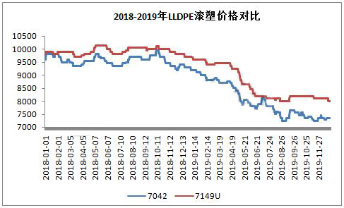 從圖中顯示,2018-2019年國(guó)內(nèi)滾塑料價(jià)格明顯高于普通線性,且價(jià)格差距逐步擴(kuò)大,2019年較普通線性高50-850元/噸。目前國(guó)內(nèi)聚烯烴行業(yè)產(chǎn)能過(guò)剩,國(guó)內(nèi)石化一直致力于高端產(chǎn)品研發(fā),搶占高端領(lǐng)域,以獲取較大利潤(rùn)。從線性區(qū)域來(lái)看,由于產(chǎn)能過(guò)剩,7042價(jià)格近兩年一直處于下行通道,削減了石化利潤(rùn)。線性行業(yè),近年來(lái),研發(fā)主要方向集中在C8線性,茂金屬、滾塑料等,其中滾塑料做為一個(gè)分支,近年研發(fā)較多。