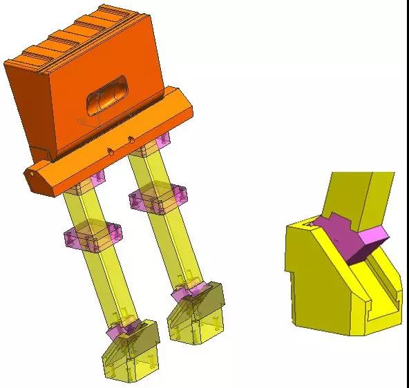 ????????模具設計中,如遇到用常規斜頂脫出產品倒扣時斜頂側向滑動與產品膠位仍有倒扣時,可以考慮頂出下落斜頂結構形式。