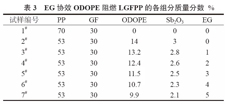 ????????將PP,ODOPE,Sb2O3,EG按一定的比例加入到高速混合機(jī)中,均勻混合后加入到雙螺桿擠出機(jī)中(溫度250℃,螺桿轉(zhuǎn)速300r/min),經(jīng)過熔融共混,熔體進(jìn)入LGF浸漬模具(溫度設(shè)定260℃),LGF經(jīng)過分散、充分浸漬,經(jīng)口模牽引拉出、水冷、風(fēng)干、造粒,得到阻燃LGFPP顆粒, 然后注塑成試樣。