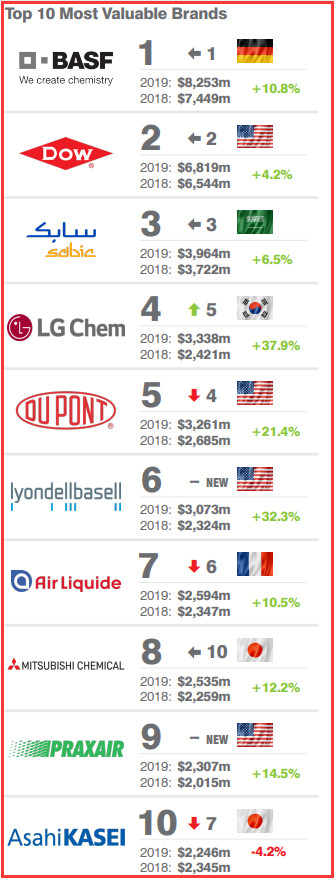 2019年的新進入者是美國的利安德巴塞爾(LyondellBasell ),品牌價值上升32%,達到31億美元,排名第六。7-10為分別是:法國液化空氣集團、日本三菱化學、美國普萊克斯和日本旭化成。